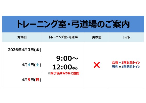 ※対象時間外はトレーニング室/弓道場利用者も入室不可